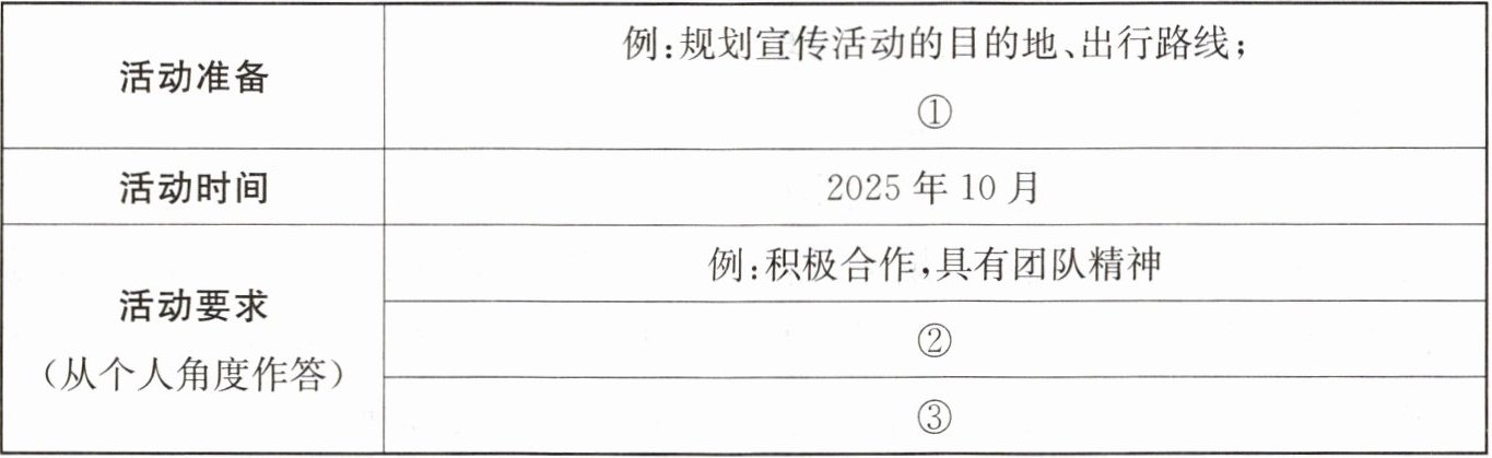 | 活动准备 | 例:规划宣传活动的目的地、出行路线;① |