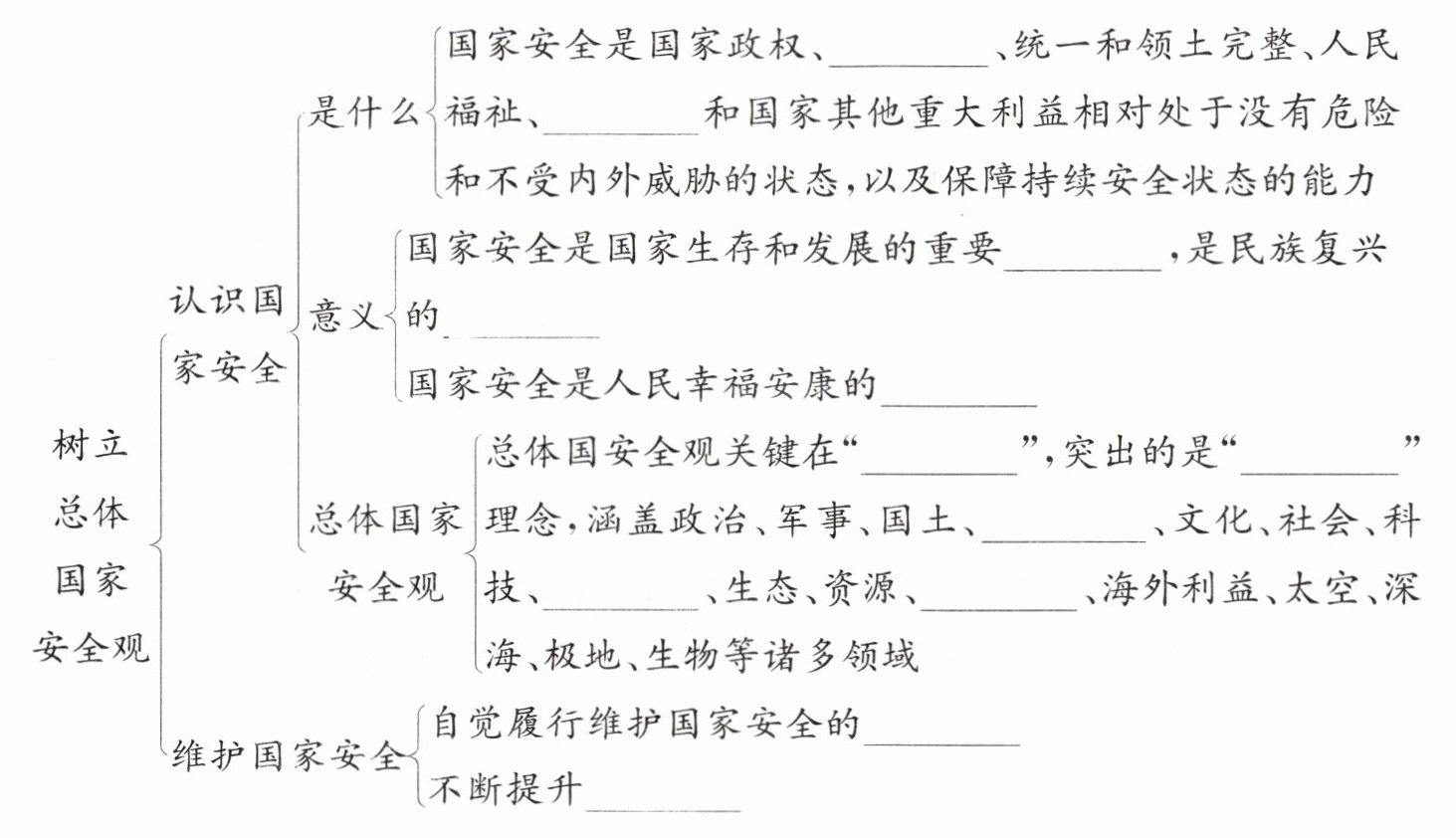 │ ├── 总体国家安全观关键在“______”,突出的是“______”理念,涵盖政治、军事、国土、______、文化、社会、科技、______、生态、资源、______、海外利益、太空、深海、极地、生物等诸多领域