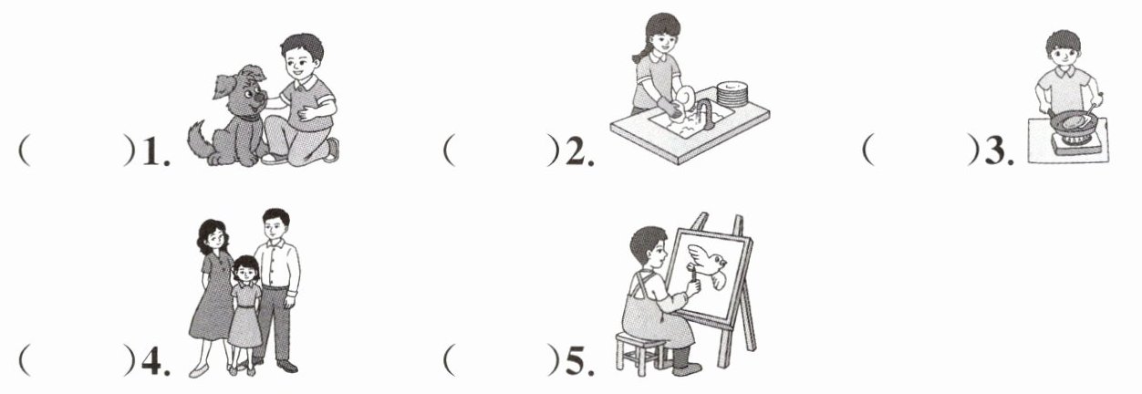 1. I can look after my doggy. 2. Mary can sweep the floor. 3. He can cook for his family. 4. Lucy has a big family. 5. Sam often talks with his family.