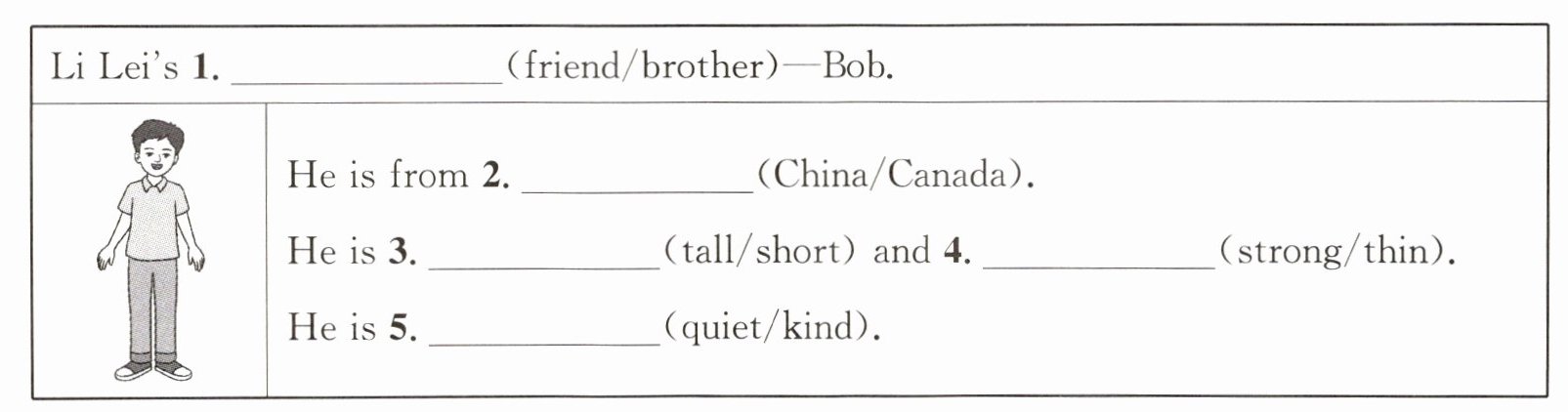 M:My name is Li Lei. I'm from Beijing,China. I have a new friend. His name is Bob. He is from Canada. He's tall,but he isn't strong. He's thin. He is very kind. He often helps me.