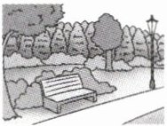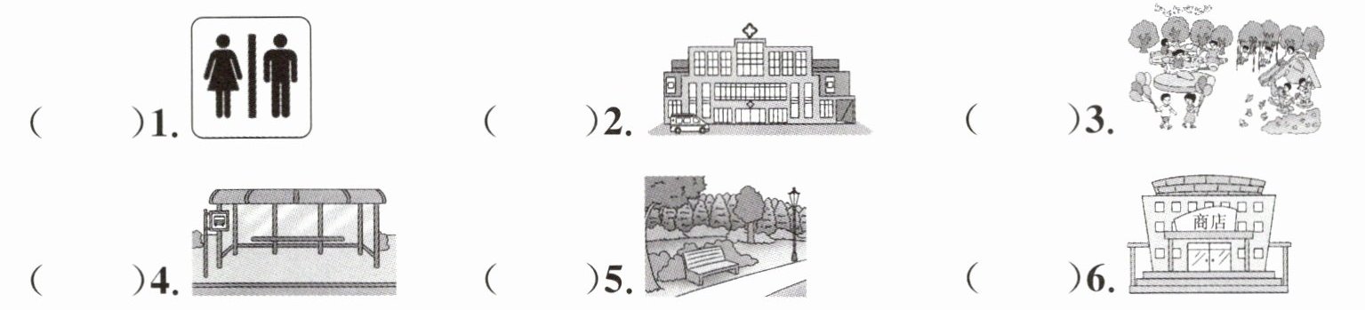 A. playground B. shop C. bus stop D. park E. toilet F. hospital