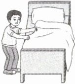 1. is making the bed 2. is sweeping the floor