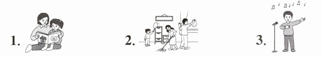 It's 6:00 in the evening. Amy's family are all at home. Look! Amy is drawing a picture. Her father is reading a book. Her mother is cooking in the kitchen. Her brother Jim is cleaning the room. Her sister Lucy is singing old songs.
