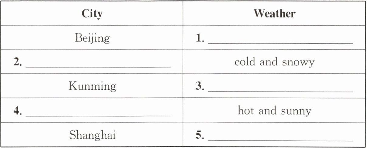 1. cold and rainy 2. Harbin 3. warm and cloudy 4. Sanya 5. cool and windy