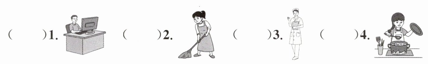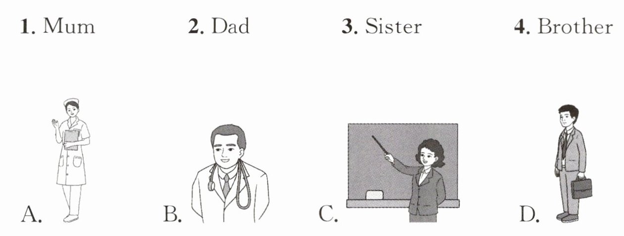 Hello, my name is Bob. I'm a student. There are five people in my family. This is my father. He's a doctor. He likes sports. This is my mother. She's a teacher. She likes reading. The tall man is my brother. He's an office worker. He's busy. I have a sister, too. She is a nurse. I love my family.