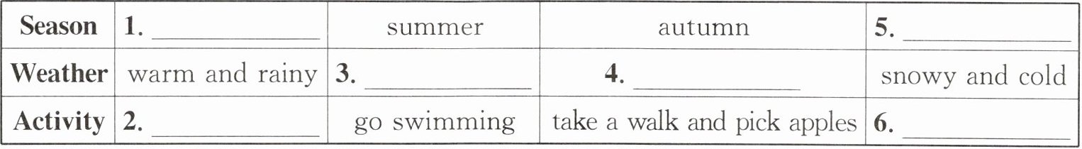 1. spring 2. plant trees and flowers 3. sunny and hot 4. windy and cool 5. winter 6. make a snowman