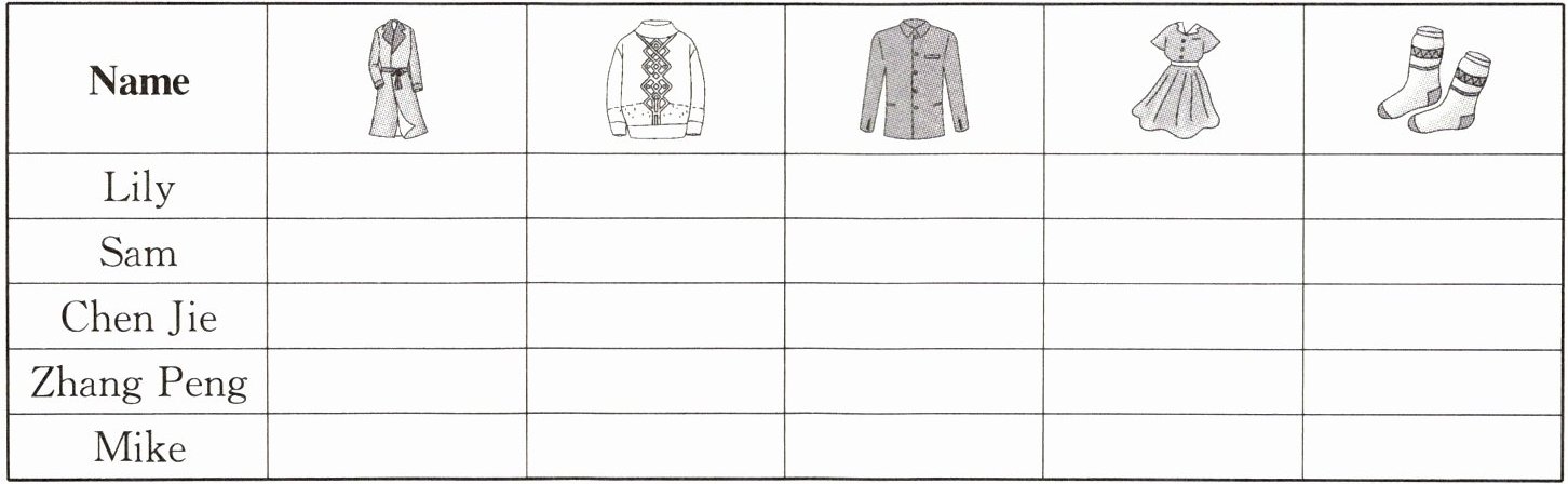 W:Hi,I'm Lily. I'm drawing pictures of clothes with my friends. Their pictures are very beautiful. Sam draws a white and green coat. Chen Jie draws a pink dress. It's very pretty. I like it very much. Zhang Peng draws blue socks. Mike draws a green shirt. It's so cool! And I draw a white sweater. It's very nice.