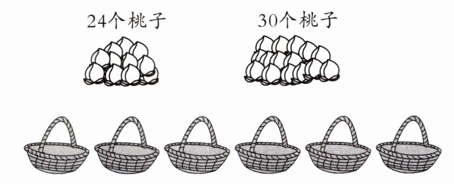 4. 要把这两堆桃子放进下面的篮子里,平均每个篮子里放几个桃子?