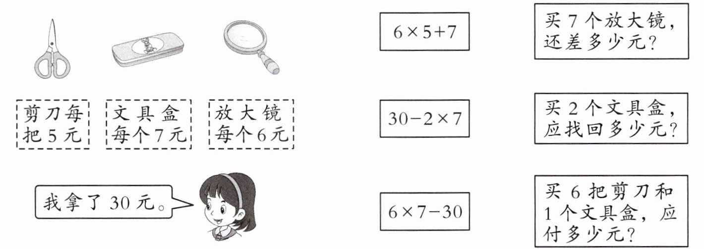 6×5+7——买6把剪刀和1个文具盒,应付多少元?
