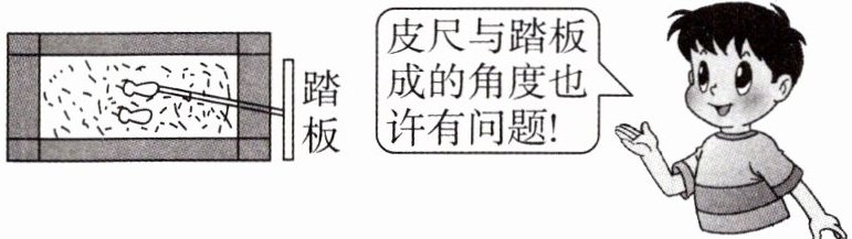 不准确。因为从直线外一点到这条直线的所有线段中,与直线垂直的线段最短。裁判员应该测量脚跟到踏板的垂直线段的长度。图中测量出的成绩要比准确成绩长一些,因此不准确。