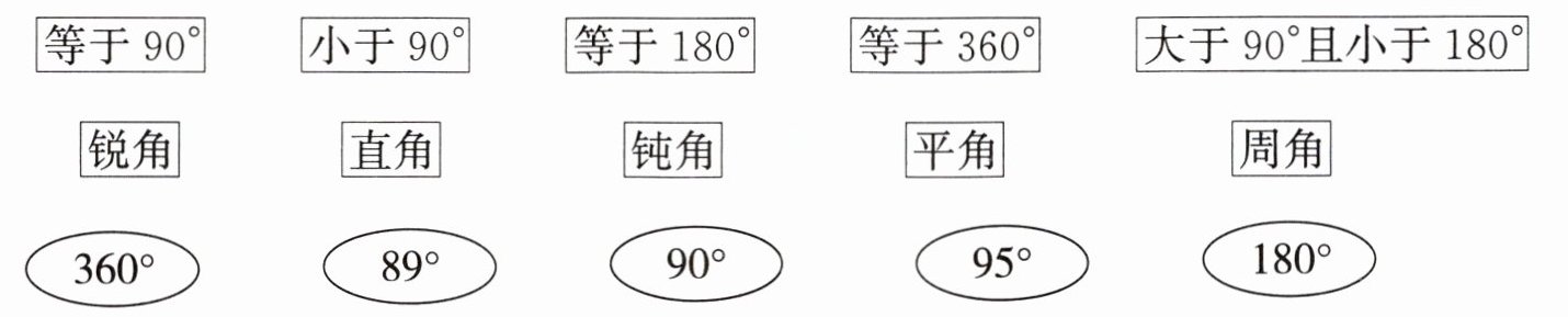 等于90°-直角,小于90°-锐角,等于180°-平角,等于360°-周角,大于90°且小于180°-钝角;360°-周角,89°-锐角,90°-直角,95°-钝角,180°-平角。