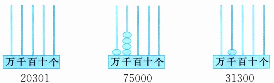 (1) (因题目要求画图,此处无法直接呈现,实际作答需在计数器对应数位画珠子:20301在万位画2颗,百位画3颗,个位画1颗;75000在万位画7颗,千位画5颗;31300在万位画3颗,千位画1颗,百位画3颗)