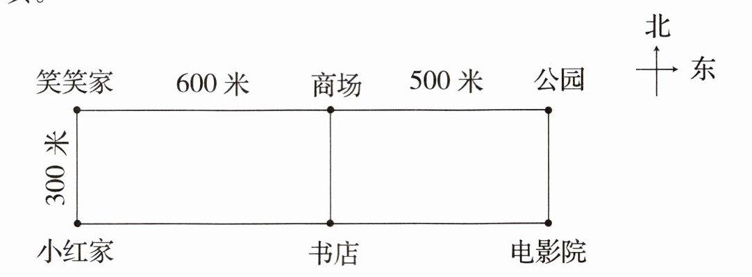 米,到达电影院。(2) 小红从家出发,先向东走 600 米,再向北走 300 米,最后又向东走 500 米,她现在在