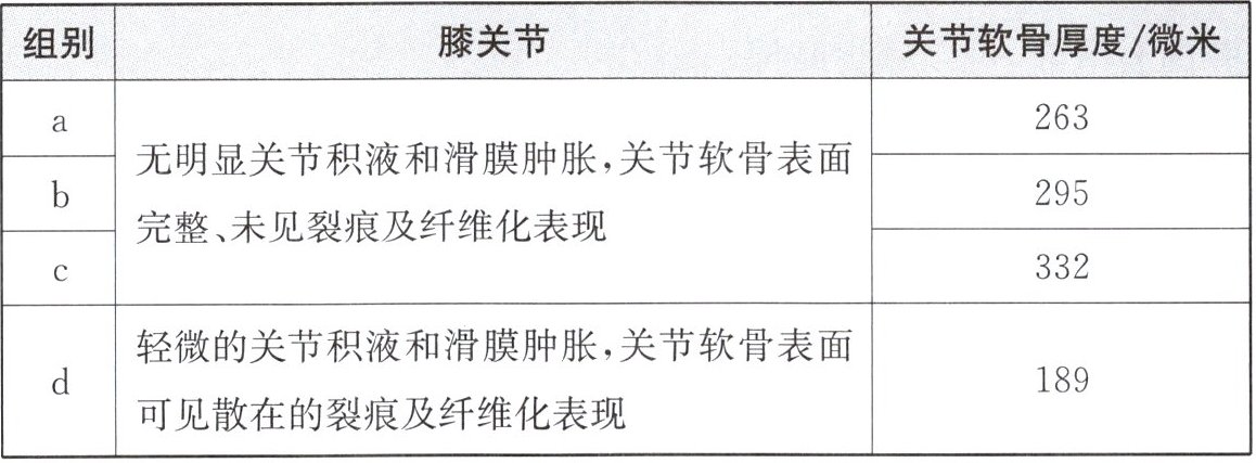 ③8周后,观察大鼠的膝关节,测量软骨厚度,结果如下表所示。