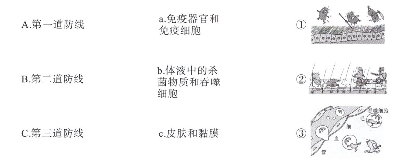 1.A—c—①② B—b—③ C—a 2.生来 多种病原体 3.出生以后 病原体 特异性免疫 4.非特异性免疫 特异性免疫