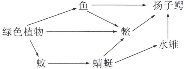 D 解析 该食物网共有5条食物链:绿色植物→鱼→扬子鳄、绿色植物→鱼→鳖→扬子鳄、绿色植物→鳖→扬子鳄、绿色植物→蚊→蜻蜓→鳖→扬子鳄、绿色植物→蚊→蜻蜓→水雉→扬子鳄,A项错误。在食物链和食物网中,一般情况下,营养级越高的生物,数量相对越少,因此数量最少的消费者是扬子鳄,B项错误。由题图可知,鱼是鳖的食物,但鱼和鳖还有共同的食物——绿色植物,因此鱼与鳖之间有捕食和竞争关系,C项错误。