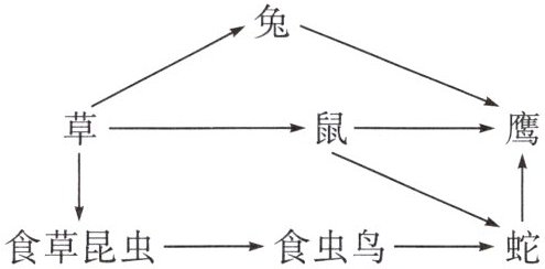 B 解析 图中食物链有草→食草昆虫→食虫鸟→蛇→鹰、草→鼠→鹰、草→兔→鹰、草→鼠→蛇→鹰,共4条,A项错误。该图中最长的食物链为草→食草昆虫→食虫鸟→蛇→鹰,在此食物链中共有5个营养级,B项正确。在食物链中,能量传递是逐级递减的,一般情况下,营养级越高的生物,数量越少,因此这个食物网中鹰的数量最少,C项错误。食物网中只含有生态系统中的生产者和消费者,不含分解者和非生物成分,D项错误。