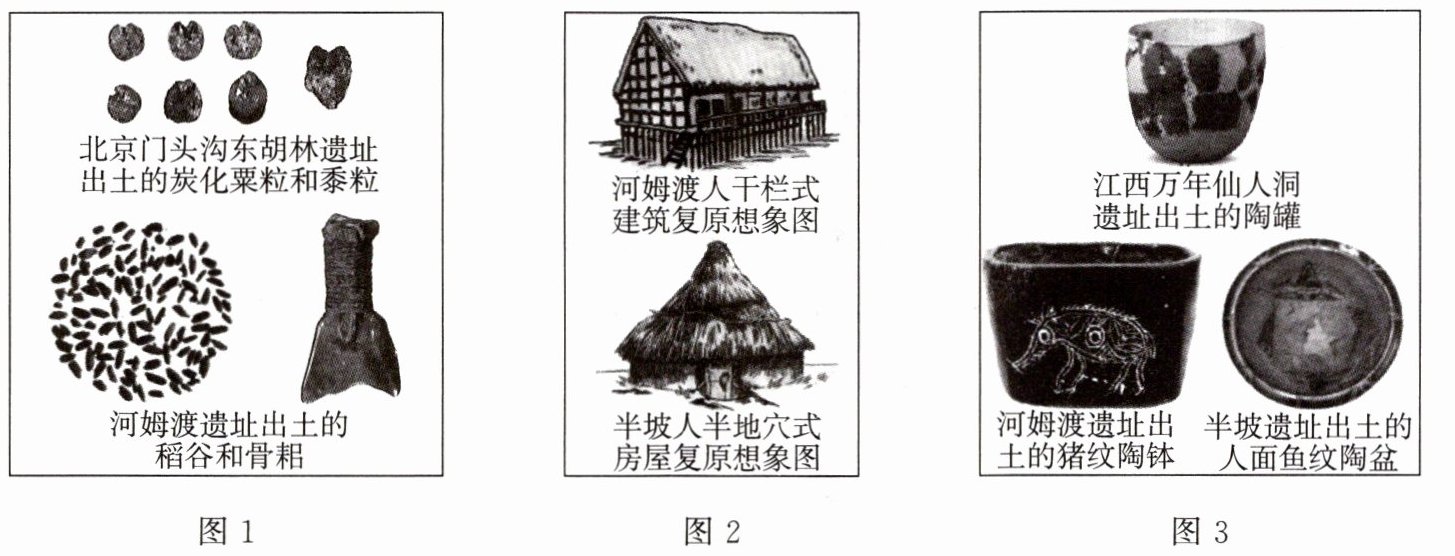 13.图1:北京地区的先民种植粟和黍,河姆渡人使用工具骨耜进行农业生产,种植水稻,共同反映了原始农业的产生。图2:河姆渡人主要居住的房屋是干栏式建筑,半坡人主要居住的房屋是半地穴式房屋,房屋样式不同反映了自然地理条件的差异,同时反映了他们已经过定居生活。图3:人面鱼纹陶盆反映了半坡人会捕鱼,陶器制作工艺高,人面鱼纹是半坡人劳动生活的艺术反映;陶罐和猪纹陶钵反映了先民会制作陶器,河姆渡人饲养猪,家畜饲养出现。