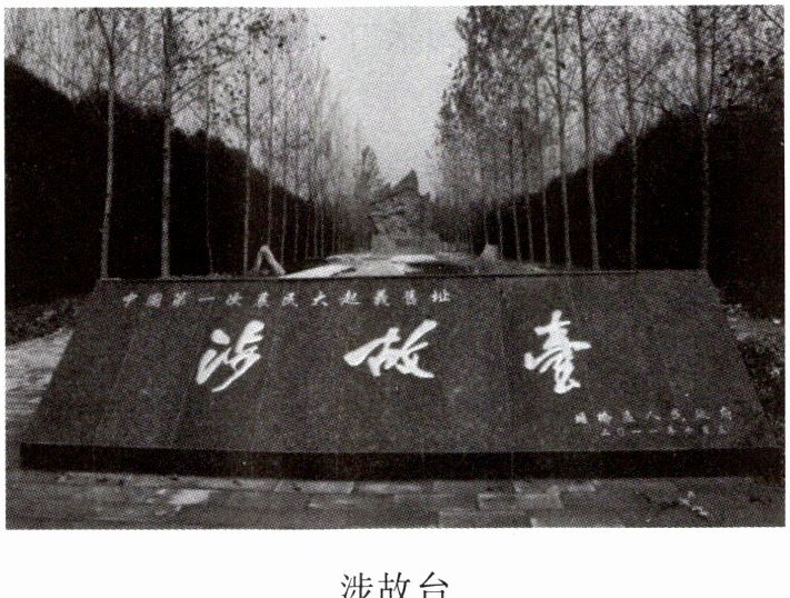 (2)涉故台,位于安徽省宿州市埇桥区大泽乡镇,是中国历史上第一次农民大起义——陈胜、吴广起义遗址。公元前209年,陈胜、吴广等900多个农民被征发去戍守渔阳,至大泽乡时,遇上大雨,道路泥泞,无法前行,不能按期到达,按照秦律,戍守误期要被处死。领队陈胜和吴广率众“斩木为兵,揭竿为旗”,发动大泽乡起义,反抗秦朝的残暴统治。因陈胜字涉,后人遂将其盟誓之坛称为“涉故台”。涉故台作为中国历史上第一次农民大起义的爆发地,是历史的载体和见证,是一座丰碑。(言之有理即可)