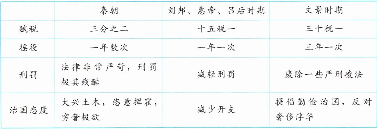 (1)施政特点:秦朝,施政暴虐,不恤民力;汉初,以农为本,与民休息。