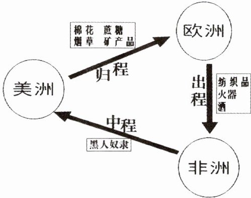 材料二 “三角贸易”兴起于16世纪,在17—18世纪成为最重要的洲际贸易。西方贩奴船在大西洋中所走的航线是欧洲—非洲—美洲,呈三角形,所以这个以贩卖黑人奴隶为中心的贸易被人们称为“三角贸易”。一次“三角贸易”的航程,大约需要半年。整个航行过程中,奴隶贩子可做三笔生意,获得数倍的暴利。从事贩奴贸易的西欧城市因此兴盛起来。