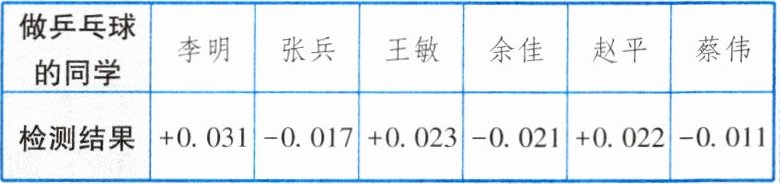 (2)因为|-0.011|<|-0.017|<|-0.021|<|+0.022|<|+0.023|<|+0.031|,所以6名同学做的乒乓球质量按照最好到最差排名为:蔡伟、张兵、余佳、赵平、王敏、李明.
