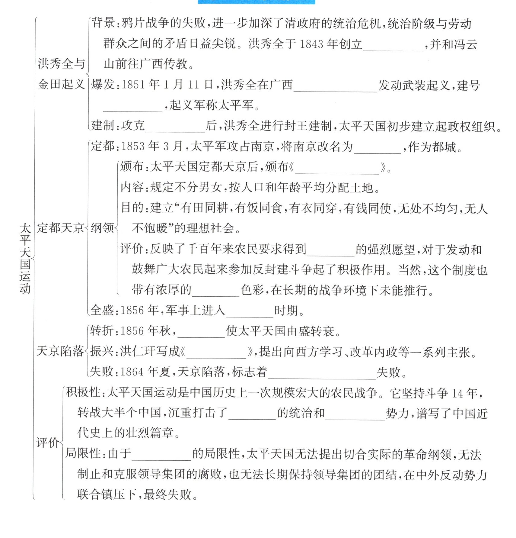 爆发:1851年1月11日,洪秀全在广西桂平金田村发动武装起义,建号太平天国,起义军称太平军。颁布:太平天国定都天京后,颁布《天朝田亩制度》。评价:反映了千百年来农民要求得到土地的强烈愿望,对于发动和鼓舞广大农民起来参加反封建斗争起了积极作用。当然,这个制度也带有浓厚的空想色彩,在长期的战争环境下未能推行。振兴:洪仁玕写成《资政新篇》,提出向西方学习、改革内政等一系列主张。