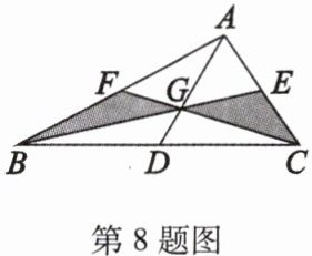 8. 如图,$△ABC$的三条中线AD,BE,CF相交于点G,且$AG:GD=2:1$,若$S_{△ABC}=18$,则图中阴影部分的面积是
