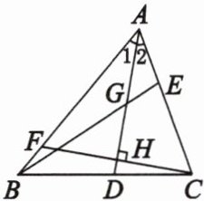 9. 如图,在$△ABC$中,$∠1=∠2$,G为AD的中点,点D在BC上,延长BG交AC于点E,且F为AB上一点,$CF⊥AD$于点H,则下列判断正确的有(