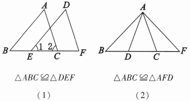 解:(1)对应顶点:点 A 和点 D,点 B 和点 E,点 C 和点 F;对应边:AB 和 DE,AC 和 DF,BC 和 EF;对应角:∠A 和∠D,∠B 和∠1,∠2 和∠F。