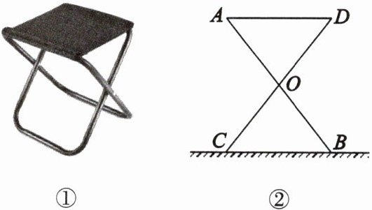 例 某中学计划为学生暑假军训配备如图①所示的折叠凳,这样设计的折叠凳坐着舒适、稳定。图②是折叠凳撑开后的侧面示意图(木条等材料宽度忽略不计),其中凳腿 $ AB $ 和 $ CD $ 的长度相等,交点 $ O $ 是它们的中点。为了使折叠凳坐着舒适,厂家将撑开后的折叠凳宽度 $ AD $ 设计为 $ 38 \, cm $,则由以上信息可推得 $ BC $ 的长度是多少?请说明理由。