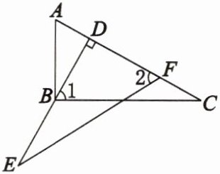 3. 如图,在$\triangle ABC$中,$\angle ABC = 90°$,$BD \perp AC$于点$D$,点$E$在$DB$的延长线上,点$F$在$AC$上,$DE = BC$,$\angle 1 = \angle 2$,求证$DF = AB$。