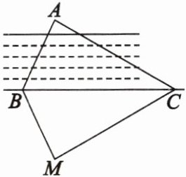 2. 如图,为了测量点$B$与河对面的目标$A$之间的距离,在点$B$同侧选择了一点$C$,测得$\angle ABC = 65°$,$\angle ACB = 30°$,然后在点$M$处立了标杆,使$\angle CBM = 65°$,$\angle MCB = 30°$,得到$\triangle MBC \cong \triangle ABC$,所以测得$MB$的长就是$A$,$B$两点之间的距离,这里判定$\triangle MBC \cong \triangle ABC$的理由是()