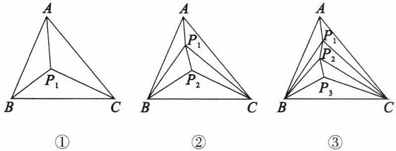 10. 在 $ \triangle ABC $ 中,有一点 $ P_1 $,当 $ P_1 $,$ A $,$ B $,$ C $ 没有任何三点在同一条直线上时,可构成三个不重叠的小三角形(如图①)。当 $ \triangle ABC $ 内点的个数增加时(如图②、图③),若其他条件不变,请探究三角形内互不重叠的小三角形的个数情况,并完成下表: