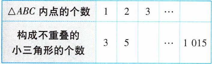 10.当△ABC内点的个数为3时,构成不重 叠的小三角形的个数为7; 当不重叠的小三角形的个数为1015时, △ABC内点的个数为507.