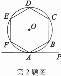 2. 如图,正六边形ABCDEF内接于⊙O,若直线PA与⊙O相切于点A,则∠PAB的度数为(