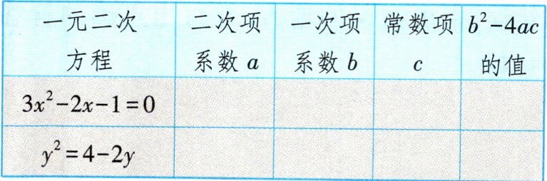 1.一元二次方程 二次项 系数$a$ 一次项 系数$b$ 常数项 $c$ $b^{2}-4ac$的值 $3x^{2}-2x-1 = 0$ $3$ $-2$ $-1$ $16$ $y^{2}=4 - 2y$ $1$ $2$ $-4$ $20$