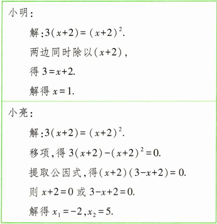 在数学活动课上,陶老师给出了这样一道题:“解方程$3(x + 2) = (x + 2)^{2}$.”