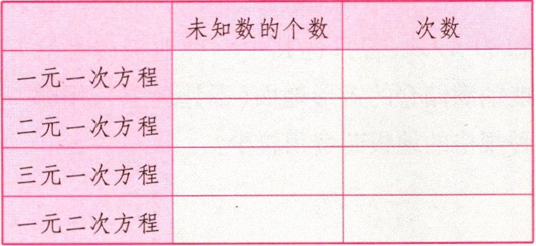 2. 比较我们所学过的整式方程,说出它们的未知数的个数和次数。