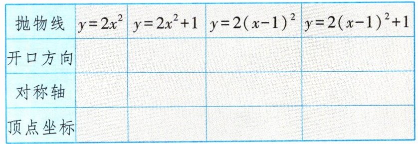 | 抛物线 | $y = 2x^{2}$ | $y = 2x^{2}+1$ | $y = 2(x - 1)^{2}$ | $y = 2(x - 1)^{2}+1$ |