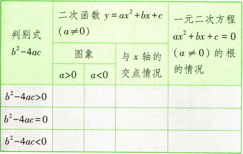 |判别式$b^2 - 4ac$|二次函数$y = ax^2 + bx + c$($a≠0$)|与$x$轴的交点情况|一元二次方程$ax^2 + bx + c = 0$($a≠0$)的根的情况|