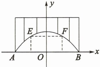 1. 如图是某抛物线形廊桥的示意图.已知抛物线对应的函数解析式为$y = -\frac{1}{2}x^2 + 10$,为保护廊桥的安全,在该抛物线上距水面AB均为8米的点E,F处要安装两盏警示灯,则这两盏灯的水平距离EF是