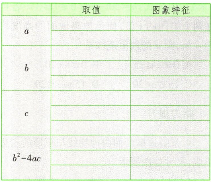 5. 二次函数$y = ax^2 + bx + c(a \neq 0)$中,$a$,$b$,$c$及$b^2 - 4ac$的符号与图象的关系是什么?请填写下表。