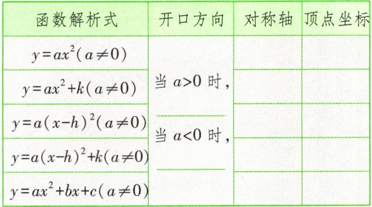2. 五种特殊的二次函数图象特征有哪些?请填写下表。