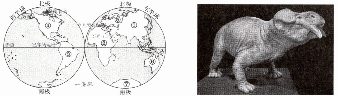 下图为东西半球示意图和肯氏兽的化石标本图片。该化石在中国、非洲以及美洲大陆等地都有发现。读图,完成5、6题。