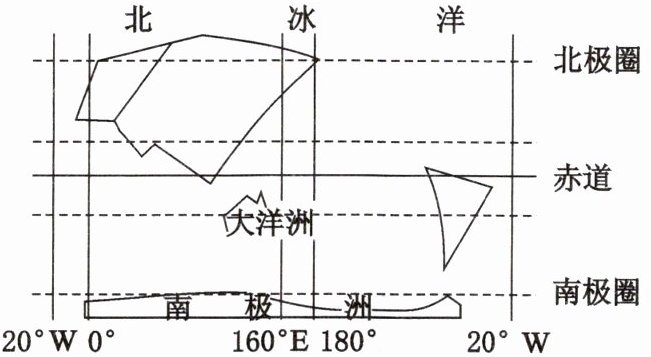 下图为某同学正在绘制的简笔世界地图,观察其中已完成的各大洲地理位置、形状特点和面积大小,请你替他完善此图。
