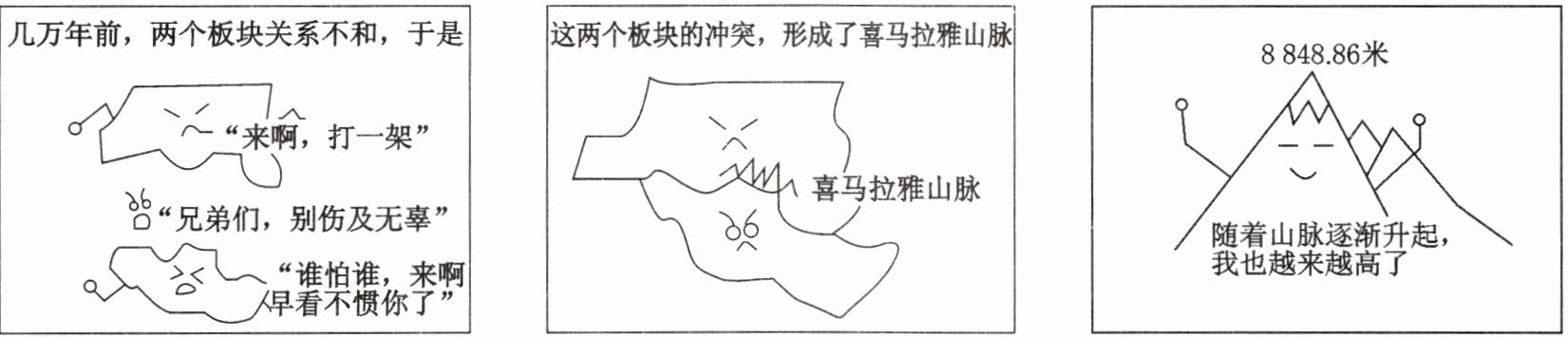 2020年12月8日,中国与尼泊尔共同宣布珠穆朗玛峰最新高程为8 848.86米。下图为某地理兴趣小组绘制的“珠峰的前世今生”漫画。据此完成10、11题。