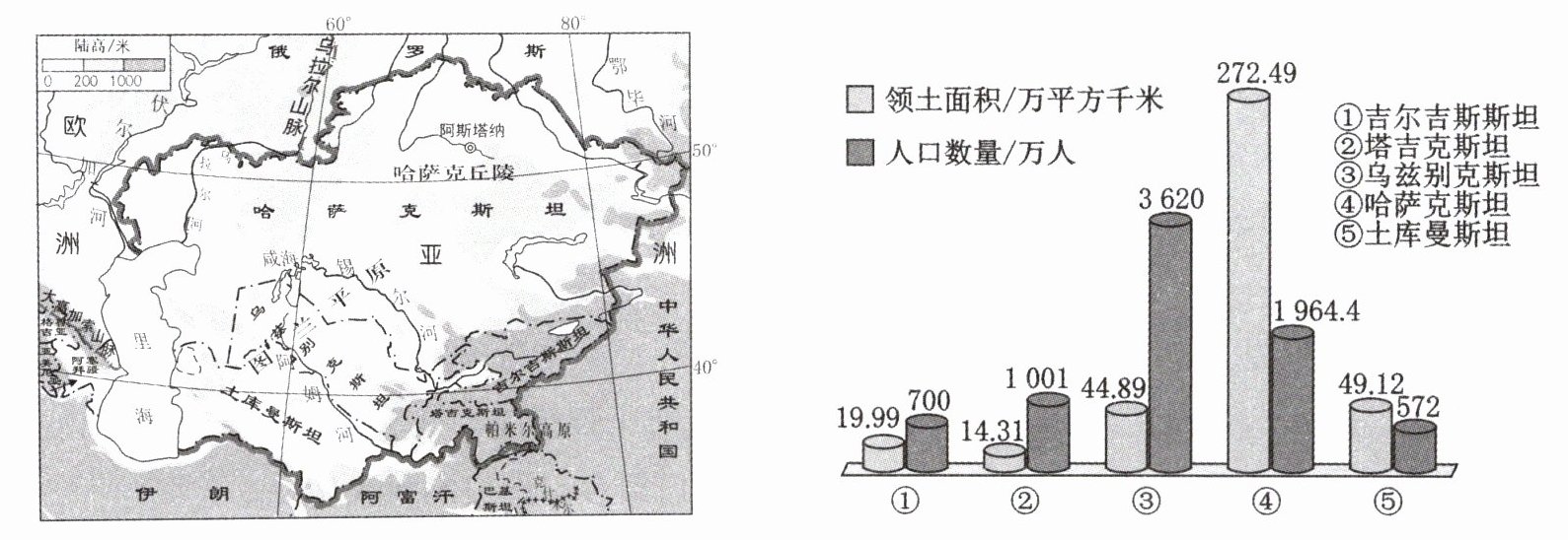 (2)题,该题考查读图能力,右图中序号代表国家,用柱状图表示各国的领土面积和人口数量。读图可知,中亚五国中人口最多的国家是乌兹别克斯坦;人口密度最小的国家是哈萨克斯坦。