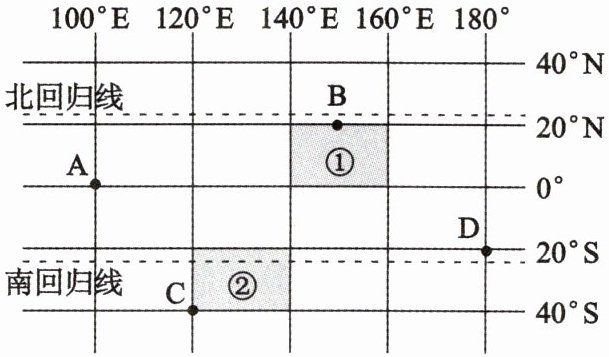 方向。(3) 比较图中①和②两个阴影区域的实际面积大小。