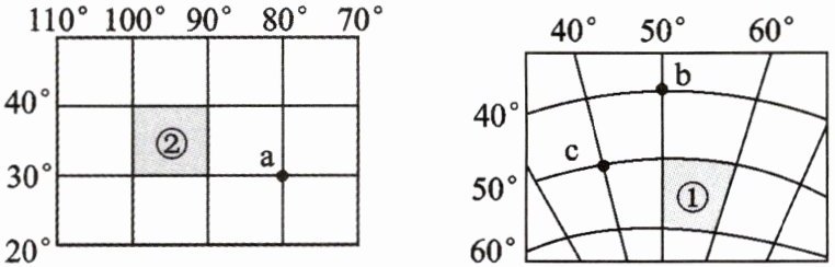 (2)阴影区域①和②中位于东半球的是哪个?